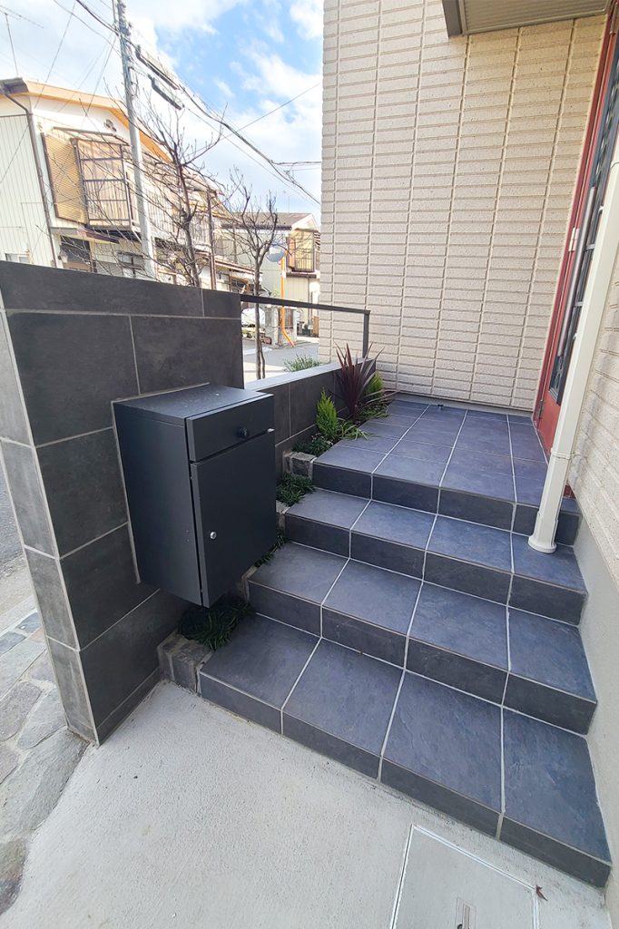 ポストも階段もモノトーンで揃えることで、